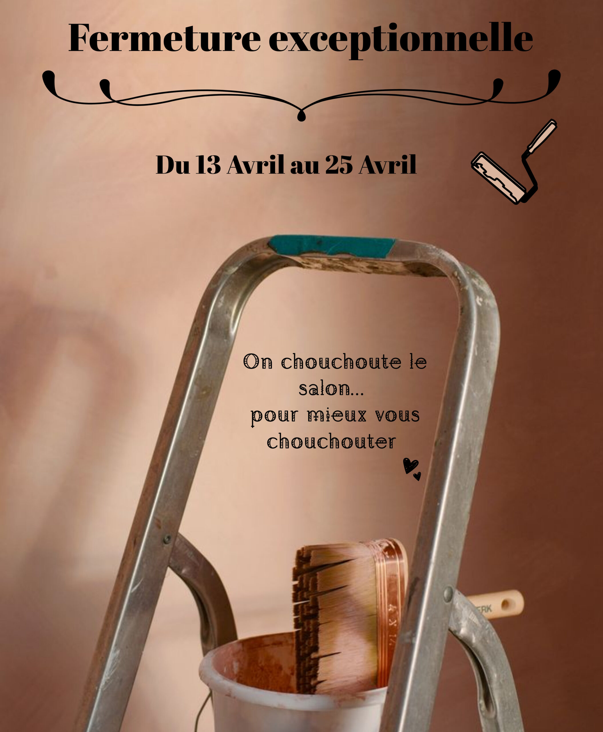 Le salon sera exceptionnellement fermé du 13 au 25 avril inclus. Cette période sera consacrée à des travaux de peinture dans l’espace cabine, afin de faire évoluer le lieu et d’améliorer votre confort lors des soins. Nous vous retrouverons à partir du 26 avril, dans un espace rafraîchi, toujours dédié à votre bien-être. Merci pour votre compréhension.