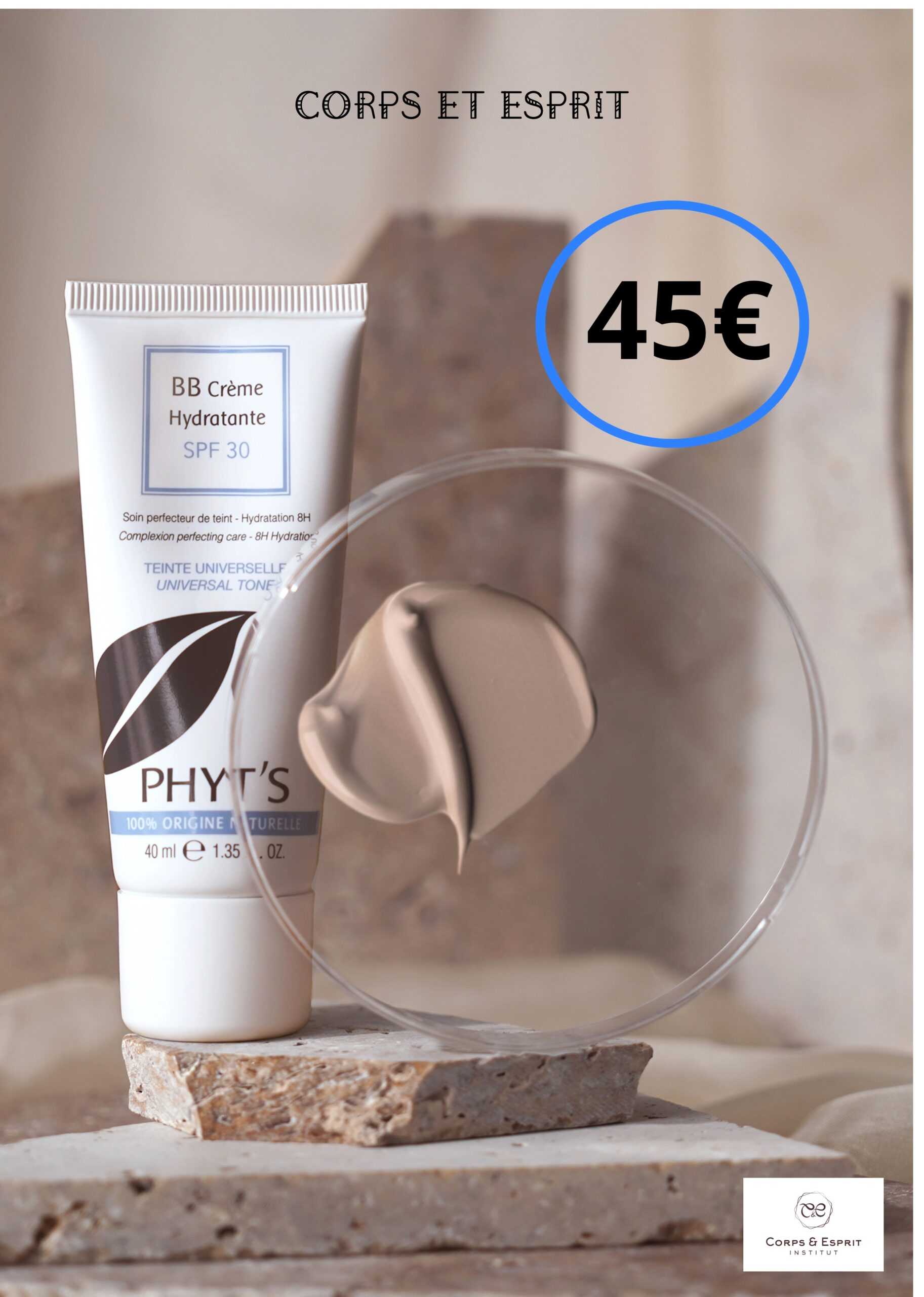 Découvrez la BB crème hydratante SPF 30 de Phyt’s, un soin teinté d’origine naturelle qui allie hydratation, protection et effet bonne mine. Sa texture légère unifie le teint tout en laissant respirer la peau. Elle est idéale pour celles et ceux qui recherchent : Un produit parfait pour simplifier sa routine beauté tout en prenant soin de sa peau. Disponible à l’institut Corps & Esprit à Parthenay.